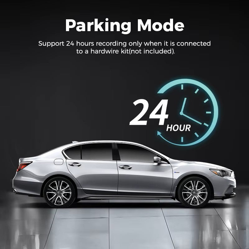 Dual USB car charger included for instant setup. Optional hardwire kit enables 24-hour Parking Mode.